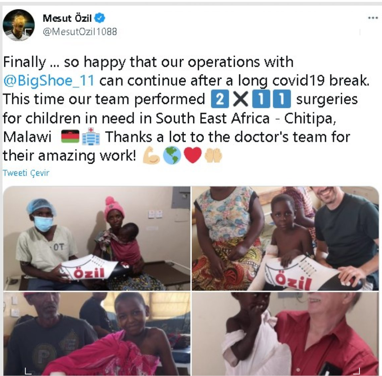Sosyal paylaşım sitesi Twitter hesabından paylaşımda bulunan Fenerbahçe'nin yıldız futbolcusu Mesut Özil, yoksul çocukların sağlık ihtiyacını futbolseverlerin desteğiyle karşılayan "Bigshoe" adlı yardım kuruluşuyla ortaklaşa olarak Afrika kıtasının güneydoğusu ile Malavi'nin Chitipa kentindeki çocuklara sağlık ekipmanı ile doktor götürüldüğünü belirtti.