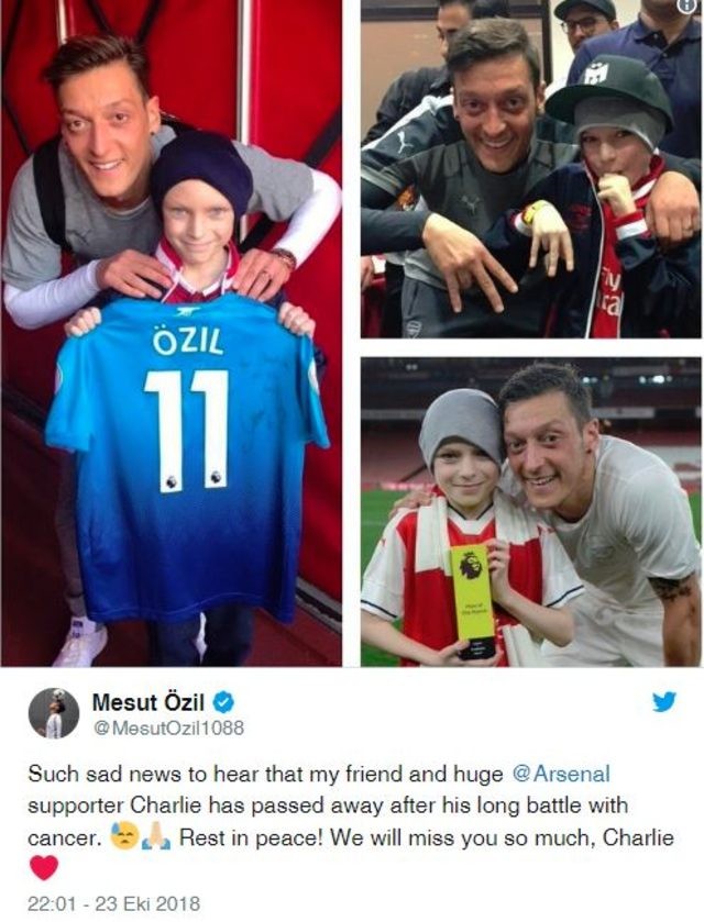 Twitter’dan bir paylaşım yapan Mesut Özil “Arkadaşım ve büyük Arsenal taraftarı Charlie’nin kanserle süren uzun soluklu savaşını kaybettiği haberini aldım. Huzur içinde yat. Seni çok özleyeceğiz, Charlie” yazdı.