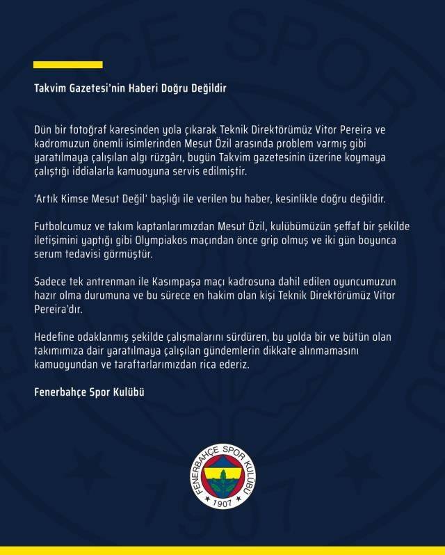 Takvim Gazetesi'nin haberi doğru değildir.Dün bir fotoğraf karesinden yola çıkarak Teknik Direktörümüz Vitor Pereira ve kadromuzun önemli isimlerinden Mesut Özil arasında problem varmış gibi yaratılmaya çalışılan algı rüzgârı, bugün Takvim gazetesinin üzerine koymaya çalıştığı iddialarla kamuoyuna servis edilmiştir.'Artık Kimse Mesut Değil' başlığı ile verilen bu haber, kesinlikle doğru değildir.Futbolcumuz ve takım kaptanlarımızdan Mesut Özil, kulübümüzün şeffaf bir şekilde iletişimini yaptığı gibi Olimpiakos maçından önce grip olmuş ve iki gün boyunca serum tedavisi görmüştür.Sadece tek antrenman ile Kasımpaşa maçı kadrosuna dahil edilen oyuncumuzun hazır olma durumuna ve bu sürece en hakim olan kişi Teknik Direktörümüz Vitor Pereira'dır.Hedefine odaklanmış şekilde çalışmalarını sürdüren, bu yolda bir ve bütün olan takımımıza dair yaratılmaya çalışılan gündemlerin dikkate alınmamasını kamuoyundan ve taraftarlarımızdan rica ederiz.