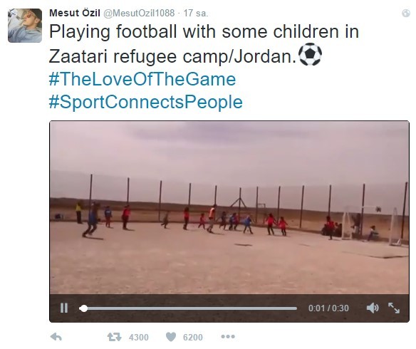 Ünlü futbolcu Mesut Özil, Ürdün'deki Zaatari Mülteci Kampı'nı ziyaret etti. Kampta yoğun bir ilgiyle karşılanan Özil, Suriyeli çocuklarla futbol oynadı.