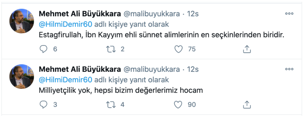 Bir diğer ilahiyatçı Mehmet Ali Büyükkara da Demir'in tweetine yanıt verdi. Büyükkara, Hilmi Demir'e "milliyetçilik" eleştirisinde bulunarak, "tüm bu İslam alimlerinin birer değer olduğunu" savundu.