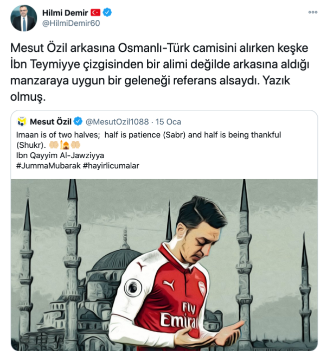 "Mesut Özil arkasına Osmanlı-Türk camisini alırken keşke İbn Teymiyye çizgisinden bir alimi değil de arkasına aldığı manzaraya uygun bir geleneği referans alsaydı. Yazık olmuş."