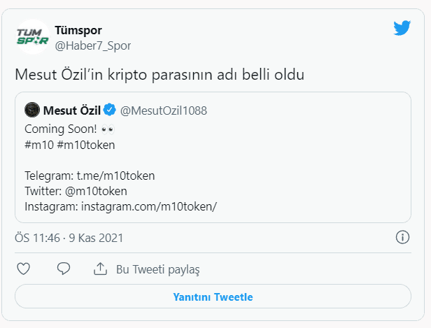 26 milyon takipçisi olan Twitter hesabından ''Çok yakında.'' paylaşımı yapan Özil'in bu gönderisi kısa sürede büyük ilgi oldu.