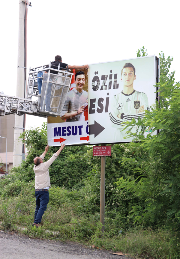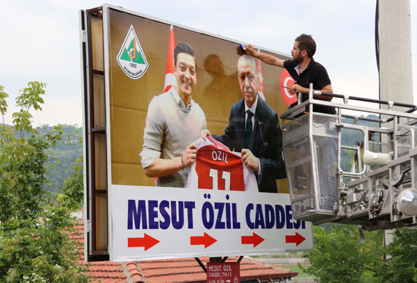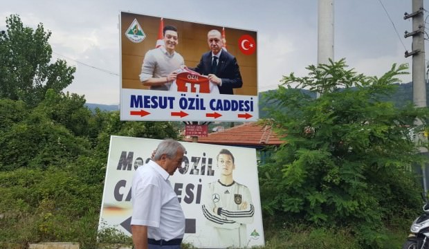 Devrek Belediyesi tarafından Özil'in, Almanya Milli Takımı formasıyla fotoğrafının yer aldığı tabela, Cumhurbaşkanı Recep Tayyip Erdoğan ile Londra'da birlikte çektirdiği fotoğrafının bulunduğu dev tabelayla değiştirildi.