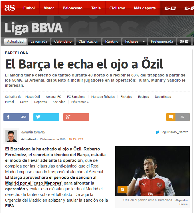 Barcelona gelecek sezon ses getirecek bir transfer için kolları sıvadı. Jaoquin Morata imzalı haberde, Barcelona yöneticisi Roberto Fernandez , Mesut'u Barcelona'ya getirmek için operasyona başladı. Oyuncunun Londra'da artık mutsuz olduğu ve kupa kazanmak için başka bir takıma gitmek istediği belirtilirken hayalinin de yeniden La Liga'ya dönmek olduğu vurgulandı. Haberde, Mesut'un Barcelona'nın kıskacına girmesine karşın bu transferde ciddi bir Real Madrid probleminin olduğu da vurgulandı.