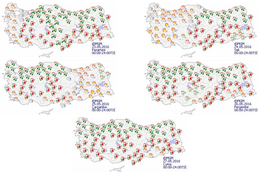 Yapılan son değerlendirmelere göre; ülke genelinin parçalı ve çok bulutlu, Marmara'nın doğusu, İç Ege, Akdeniz, İç Anadolu, Karadeniz, Doğu Anadolu'nun kuzey ve batısı ile Balıkesir, Muğla, Bingöl, Muş, Bitlis, Şırnak, Diyarbakır, Batman ve Siirt çevrelerinin sağanak ve gök gürültülü sağanak yağışlı geçeceği tahmin ediliyor. Yağışların; sabah saatlerinde Sakarya, Düzce, Adana ve Osmaniye, öğleden sonra Tokat, Ankara'nın doğu ilçeleri, Kırıkkale, Kırşehir, Yozgat, Nevşehir, Kayseri, Niğde,Aksaray'ın doğu ilçeleri, Adana ve Osmaniye çevrelerinde yerel olarak kuvvetli olması bekleniyor.