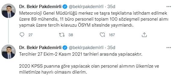 Tarım ve Orman Bakanı Bekir Pakdemirli sosyal medya hesabı üzerinden verdiği müjdeli haberde, “Meteoroloji Genel Müdürlüğü merkez ve taşra teşkilatına istihdam edilmek üzere 89 mühendis, 11 büro personeli toplam 100 sözleşmeli personel alımı yapmak üzere tercih kılavuzu ÖSYM sitesinde yayımlandı. Tercihler 27 Ekim-2 Kasım 2021 tarihleri arasında yapılacaktır. 2020 KPSS puanına göre yapılacak olan personel alımının ülkemize ve milletimize hayırlı olmasını dilerim” ifadelerini kullandı.