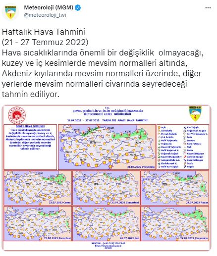 Meteoroloji Genel Müdürlüğü, resmi sosyal medya hesabından yapılan açıklamada, “Haftalık Hava Tahmini (21 - 27 Temmuz 2022) Hava sıcaklıklarında önemli bir değişiklik olmayacağı, kuzey ve iç kesimlerde mevsim normalleri altında, Akdeniz kıyılarında mevsim normalleri üzerinde, diğer yerlerde mevsim normalleri civarında seyredeceği tahmin ediliyor” denildi.