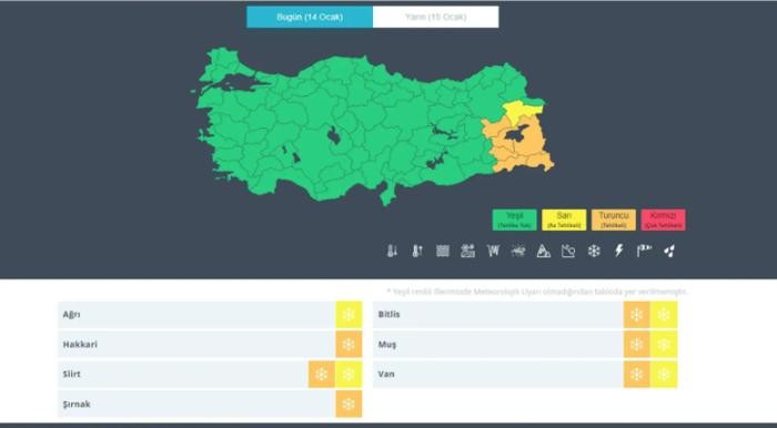 Meteoroloji, Ağrı, Hakkari, Siirt, Şırnak, Bitlis, Muş ve Van için sarı ve turuncu kodlu uyarı verdi. Vatandaşların kuvvetli kar yağışı nedeniyle yaşanacak aksiliklere karşı dikkatli ve tedbirli olmaları istendi.