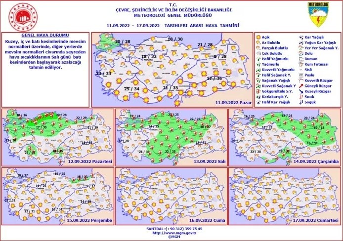 Meteoroloji Genel Müdürlüğü (MGM) tarafından yayımlanan 5 günlük hava tahmin raporuna göre, 11 Eylül Pazartesi gününden itibaren yurdun birçok bölgesinde 'sağanak yağış' ve ' gök gürültülü sağanak yağışların etkili olması bekleniyor. Meteoroloji, vatandaşları, sel ve su baskınları ile aşırı yağışlar nedeniyle meydana gelebilecek diğer olumsuzluklara karşı uyardı.