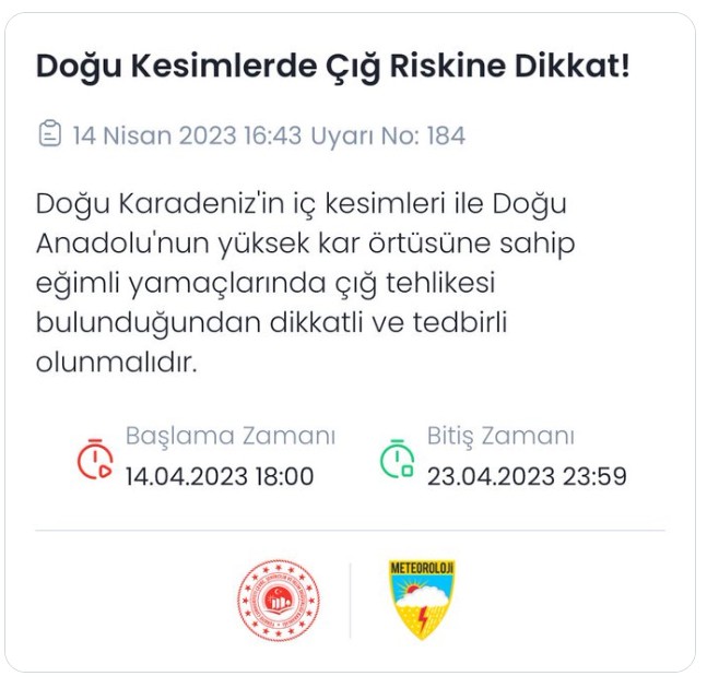“Doğu Karadeniz’in iç kesimleri ile Doğu Anadolu’nun yüksek kar örtüsüne sahip eğimli yamaçlarında çığ tehlikesi bulunduğundan dikkatli ve tedbirli olunmalıdır.”