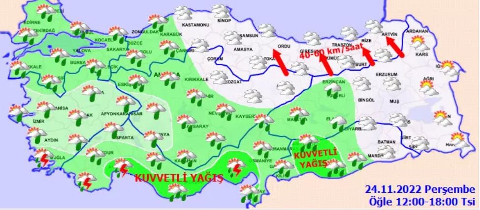 Meteoroloji Genel Müdürlüğü tarafından yapılan son değerlendirmelere göre; Ülkemiz genelinin parçalı ve çok bulutlu, Marmara, Ege, Akdeniz Bölgeleri ile (Kastamonu, Sinop hariç) Batı Karadeniz, İç Anadolu'nun batı ve güney, Doğu ve Güneydoğu Anadolu'nun batı kesimlerinin sağanak ve yer yer gök gürültülü sağanak yağışlı geçeceği tahmin ediliyor. Yağışların Güney Ege ve Akdeniz kıyıları ile Kütahya, Uşak, Bolu, Düzce, Zonguldak, Adıyaman ve Şanlıurfa ile Ankara’nın kuzeybatı, Manisa'nın güney ve doğu, Burdur'un doğu, Isparta, İzmir, Balıkesir ve Bursa'nın güney çevrelerinde yerel kuvvetli, Antalya’nın doğu kıyı ilçelerinde yer yer çok kuvvetli ve şiddetli olması bekleniyor.