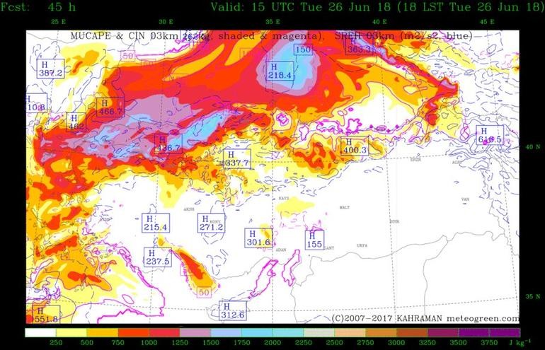 Yrd. Doç. Dr. Kahraman, "Eldeki verilere göre bölgede sıradan gök gürültülü fırtınaların dışında, süper hücreli fırtına oluşumu da ihtimal dahilinde. Bunlar yine dar alanlarda ceviz büyüklüğünde dolu üretebilir, yerel sellere neden olabilirler. İlla olacak demiyorum, bunu kimse söyleyemez, ama çevre koşulları bu tip hadiselerin görüldüğü durumlara uygunluk gösteriyor. Hortum ihtimali zayıf" açıklamasını yaptı.