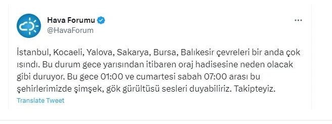 Söz konusu uyarı metninde şu ifadelere yer verildi: "İstanbul, Kocaeli, Yalova, Sakarya, Bursa, Balıkesir çevreleri bir anda çok ısındı. Bu durum gece yarısından itibaren oraj hadisesine neden olacak gibi duruyor. Bu gece 01:00 ve cumartesi sabah 07:00 arası bu şehirlerimizde şimşek, gök gürültüsü sesleri duyabiliriz. Takipteyiz."