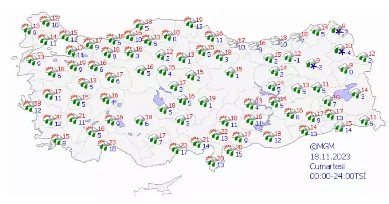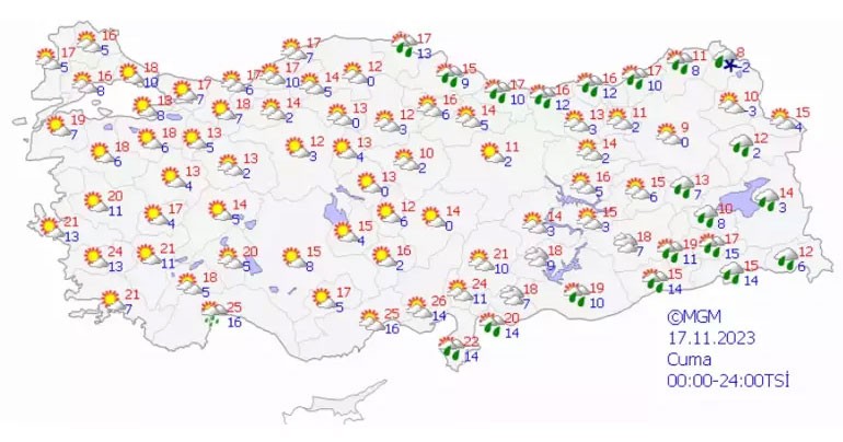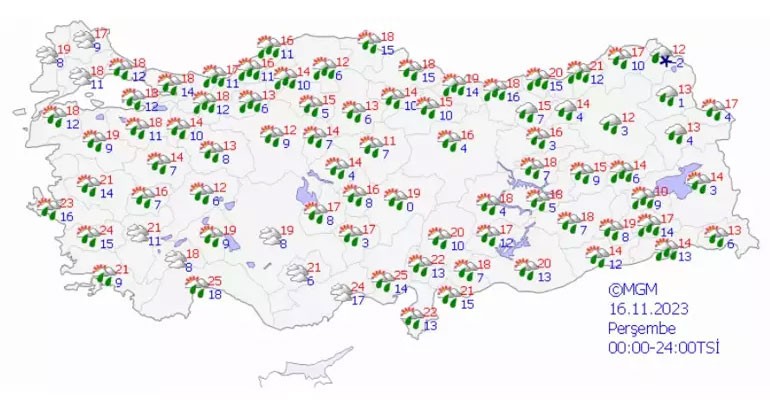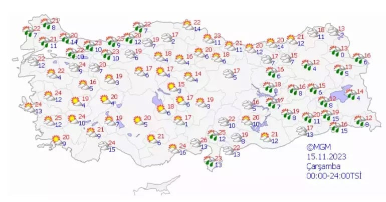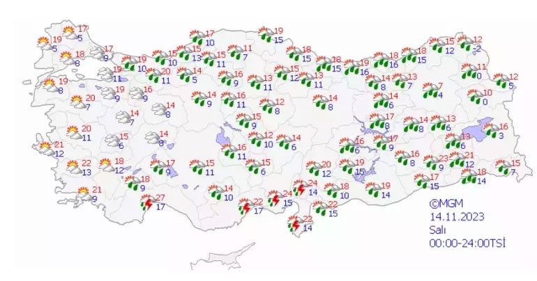 Son verilere göre; Ülkemiz genelinin parçalı ve yer yer çok bulutlu, Trakya ile Çanakkale dışında kalan diğer bölgelerimizin aralıklı sağanak ve yer yer gök gürültülü sağanak yağışlı geçeceği tahmin ediliyor. Yağışların; bu akşam saatlerinde Batı Akdeniz, Batı Karadeniz ile Kocaeli, Sakarya, Denizli, Eskişehir, Ankara'nın kuzey ve batısı, Kilis, G. Antep ve Adıyaman çevrelerinde yarın Ordu, Giresun, Malatya, Tunceli, Erzurum, Kars, Bingöl ve Muş çevreleri ile öğle saatlerinden itibaren Giresun, Trabzon ve Rize çevrelerinde yer yer kuvvetli olması bekleniyor.