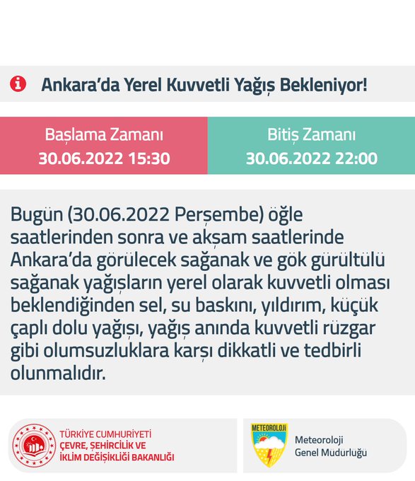 Çevre ve Şehircilik Bakanlığı, Meteoroloji Genel Müdürlüğü bugün Ankara için sarı uyarı yayınladı.