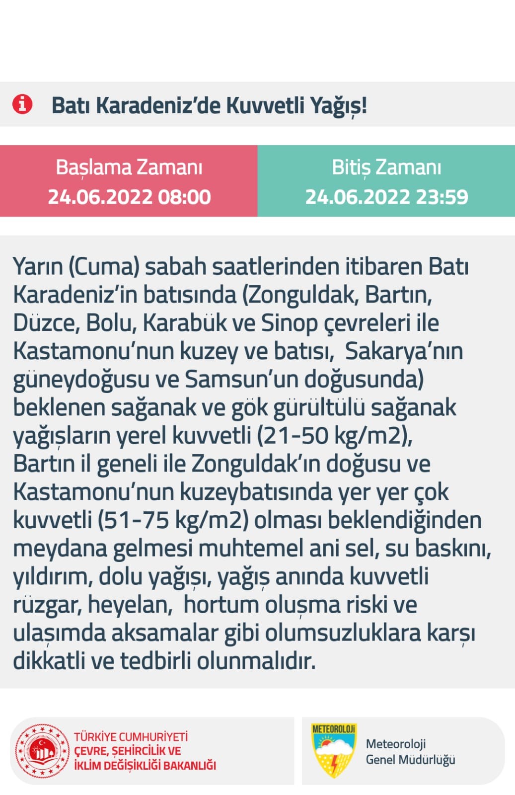Meteoroloji Genel Müdürlüğü’nün sosyal medya hesabından yapılan paylaşımda Karadeniz’in batısı için yarın için kuvvetli yağış uyarısı yapılırken, ani sel, su baskını, yıldırım, dolu yağışı konularında vatandaşların dikkatli olması istenildi. Yapılan açıklamada şu ifadelere yer verildi; Başlama Zamanı 24.06.2022 08:00, Bitiş Zamani 24.06.2022 23:59 Yarın (Cuma) sabah saatlerinden itibaren Batı Karadeniz'in batısında (Zonguldak, Bartın, Düzce, Bolu, Karabük ve Sinop çevreleri ile Kastamonu'nun kuzey ve batısı, Sakarya'nın güneydoğusu ve Samsun'un doğusunda) beklenen sağanak ve gök gürültülü sağanak yağışların yerel kuvvetli (21-50 kg/m2), Bartın il geneli ile Zonguldak'ın doğusu ve Kastamonu'nun kuzeybatısında yer yer çok kuvvetli (51-75 kg/m2) olması beklendiğinden meydana gelmesi muhtemel ani sel, su baskını, yıldırım, dolu yağışı, yağış anında kuvvetli rüzgar, heyelan, hortum oluşma riski ve ulaşımda aksamalar gibi olumsuzluklara karşı dikkatli ve tedbirli olunmalıdır.”