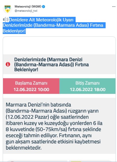 Meteoroloji Genel Müdürlüğünden yapılan açıklamaya göre, “Marmara Denizi'nin batısında (Bandırma-Marmara Adası) rüzgarın yarın (12.06.2022 Pazar) öğle saatlerinden itibaren kuzey ve kuzeydoğu yönlerden 6 ila 8 kuvvetinde (50-75km/sa) firtina seklinde eseceği tahmin ediliyor. Fırtınanın, aynı gün akşam saatlerinde etkisini kaybetmesi beklenmektedir” denildi.