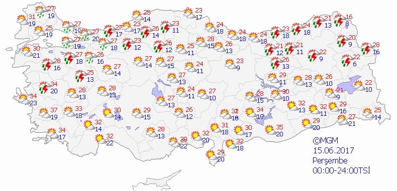 Meteoroloji Genel Müdürlüğünden yapılan son değerlendirmelere göre, Marmara'nın kuzey ve doğusu, Batı Karadeniz, Orta Karadeniz kıyıları, Doğu Karadeniz, Doğu Anadolu'nun kuzeyi ile Çanakkale, Balıkesir, Kütahya, Manisa, Uşak, Amasya çevreleri ile Tokat'ın kuzey kesimleri, Çanakkale'nin doğu kesimleri ve Akdeniz'in iç kesimlerinin yükseklerinin kısa süreli ve yerel olmak üzere sağanak ve yer yer gök gürültülü sağanak yağışlı geçeceği tahmin ediliyor.
