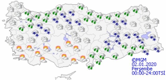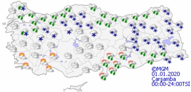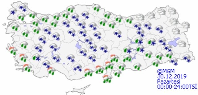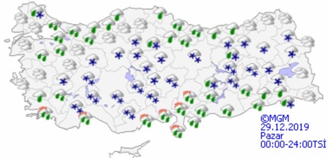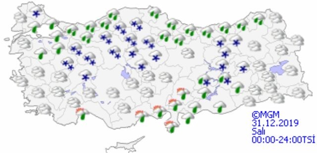 Meteoroloji Genel Müdürlüğü tarafından yapılan son değerlendirmelere göre: Marmara’nın doğusu, Akdeniz, İç Anadolu, Batı ve Orta Karadeniz, Doğu Karadeniz'in iç kesimleri, Doğu ve Güneydoğu Anadolu, Kırklareli, Aydın, Muğla, Denizli, Afyonkarahisar, Trabzon ve Giresun çevreleri ile Tekirdağ'ın doğu ilçelerinin yağışlı geçeceği tahmin ediliyor. Yağışların; kıyı kesimler ile Güneydoğu Anadolu’da yağmur ve sağanak, yağış alan diğer yerlerde karla karışık yağmur ve kar şeklinde olması bekleniyor.