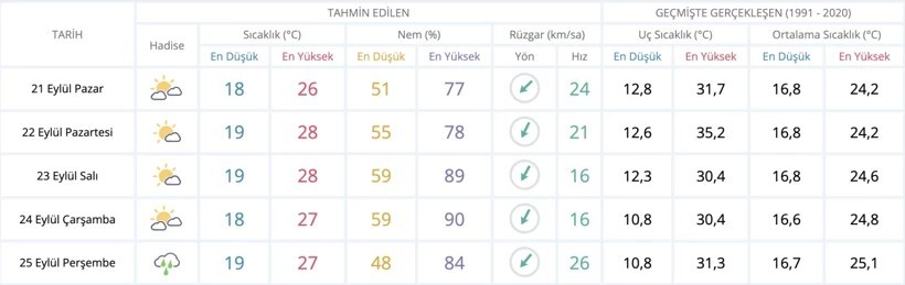 21 Eylül Pazar: Parçalı bulutlu – En düşük: 18, En yüksek: 26