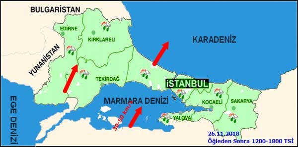 Meteoroloji Genel Müdürlüğü’nden alınan tahminlere göre, hava sıcaklığı kuzey, iç ve batı kesimlerde 2 ila 5 derece artacak, diğer yerlerde önemli bir değişiklik olmayacak. Rüzgarın, genellikle kuzey, zamanla iç ve batı kesimlerde güney yönlerden hafif ve orta kuvvette; zamanla batı ve kuzey kesimlerde kuvvetlice (30-50 km/saat), Marmara'nın batısı ve Kıyı Ege'de yer yer kuvvetli (40-60 km/saat) olarak eseceği tahmin ediliyor.