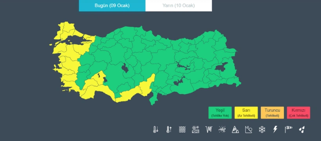 KUVVETLİ YAĞIŞ UYARISI 1: Yapılan son değerlendirmelere göre; yurdun batı kesimlerinde görülecek yağışların, Muğla ve Çanakkale çevreleri, İzmir ve Manisa’nın kuzey ve batı, Balıkesir’in güney ve batı ile Aydın’ın kıyı ilçelerinde kuvvetli (21-50 kg/m2), Muğla’nın kıyı kesimlerinde yer yer çok kuvvetli (51-75 kg/m2) olması bekleniyor. Genellikle sağanak ve gök gürültülü sağanak, akşam saatlerinden sonra sıcaklıkların düşmesiyle birlikte Manisa ve Balıkesir’in yüksek kesimlerinde (1000 m üzeri) ve Çanakkale'de karla karışık yağmur ve kar şeklinde beklenen kuvvetli yağışların sebep olacağı sel, su baskını, yıldırım, kıyı kesimlerde hortum riski ve yerel dolu yağışı, kar yağışı beklenen bölgenin kuzey ve iç kesimlerinde kuvvetli rüzgar ile birlikte tipi gibi olumsuzluklara karşı dikkatli ve tedbirli olunması gerekmektedir.
