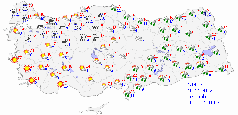 Meteoroloji Genel Müdürlüğü tarafından yapılan son değerlendirmelere göre: Ülkemiz genelinin parçalı ve çok bulutlu, Doğu Akdeniz'in doğusu, Orta Karadeniz kıyıları, Doğu Karadeniz ile Doğu ve Güneydoğu Anadolu ile Sinop, Karaman ve Niğde çevrelerinin yağışlı, diğer yerlerin az bulutlu ve açık geçeceği tahmin ediliyor. Yağışların, genellikle yağmur ve sağanak, Doğu Karadeniz’in iç kesimlerinin yüksekleri ve Doğu Anadolu'nun kuzey ve doğusunun yükseklerinde karla karışık yağmur ve yer yer kar şeklinde görülmesi bekleniyor. Yağışların yarın Batman ve Siirt çevrelerinde kuvvetli olması bekleniyor. Gece ve sabah saatlerinde Marmara, İç Ege ve Batı Karadeniz'in iç kesimlerinde pus ve yer yer sis bekleniyor.