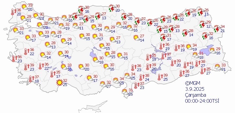 Güneydoğu Anadolu: Açık ve çok sıcak. Diyarbakır 39°C, Gaziantep 38°C.