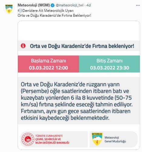 Meteoroloji Genel Müdürlüğü (MGM) resmi sosyal medya hesabından yapılan paylaşımda, “Orta ve Doğu Karadeniz'de rüzgârın yarın (Perşembe) öğle saatlerinden itibaren batı ve kuzeybatı yönlerden 6 ila 8 kuvvetinde (50-75 km/sa) fırtına şeklinde eseceği tahmin ediliyor. Fırtınanın, aynı gün gece saatlerinden itibaren etkisini kaybedeceği beklenmektedir” ifadeleri yer aldı.