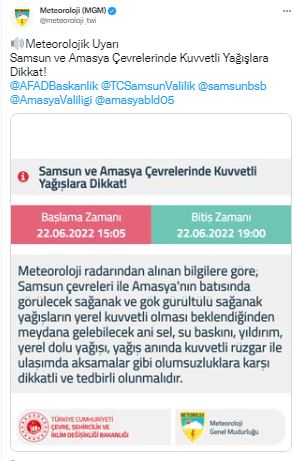 Meteoroloji Genel Müdürlüğü, resmi sosyal medya hesabından yapılan açıklamada, “Meteoroloji radarından alınan bilgilere göre; Samsun çevreleri ile Amasya'nın batısında görülecek sağanak ve gök gürültülü sağanak yağışların yerel kuvvetli olması beklendiğinden meydana gelebilecek ani sel, su baskını, yıldırım, yerel dolu yağısı, yağış anında kuvvetli rüzgar ile ulaşımda aksamalar gibi olumsuzluklara karşı dikkatli ve tedbirli olunmalıdır” denildi.