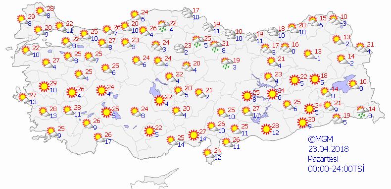 Hava Durumu: Az bulutlu ve açık, Rüzgar: Güney ve güneybatıdan 2 ila 4 (10-30 km/sa), akşam saatlerinde Orta Akdeniz'de 3 ila 5 (20-40 km/sa) kuvvetinde; Dalga: 0,5 ila 1,5m; Görüş: İyi.