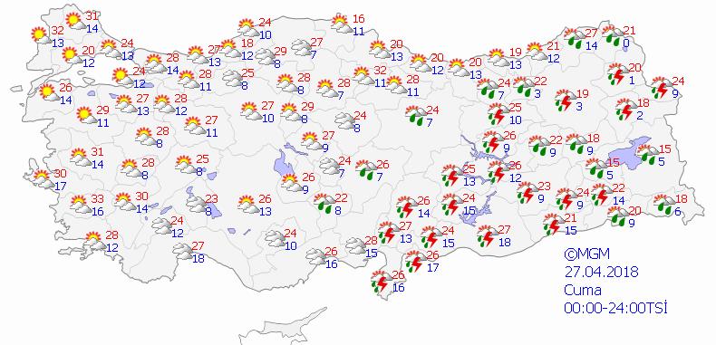 Parçalı bulutlu, öğle saatlerinden sonra iç kesimleri kısa süreli ve yerel olmak üzere sağanak ve gök gürültülü sağanak yağışlı
