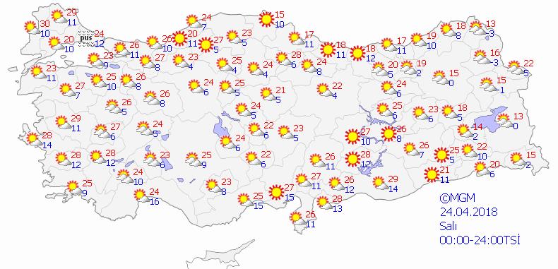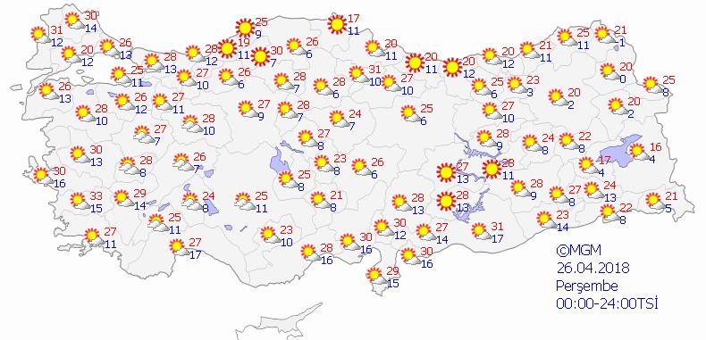 Ülkemizin doğu kesimlerinin parçalı yer yer çok bulutlu, öğle saatlerinden sonra Amasya, Tokat ve Sivas çevreleri ile Kastamonu, Sinop, Samsun, Ordu ve Giresun’un iç kesimlerinin kısa süreli ve yerel olmak üzere sağanak ve gök gürültülü sağanak yağışlı, diğer yerlerin az bulutlu ve açık geçeceği tahmin ediliyor.