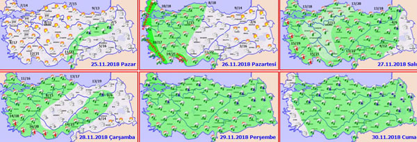 Yapılan son değerlendirmelere göre, yurt genelinin parçalı ve çok bulutlu; Doğu Akdeniz ve Doğu Anadolu'nun kuzeybatısı ile Gaziantep ve Kilis çevrelerinin yağışlı geçeceği tahmin ediliyor. Yağışların genellikle yağmur ve sağanak, Doğu Anadolu'nun yağış alan yerlerinde yağmur ve karla karışık yağmur şeklinde olması bekleniyor.