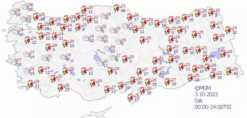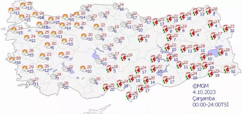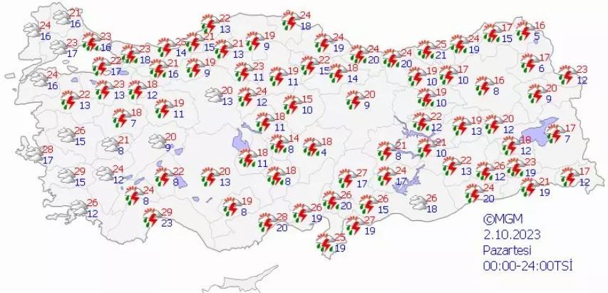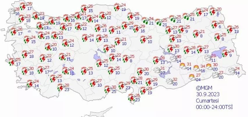 Meteoroloji Genel Müdürlüğü tarafından yapılan son değerlendirmelere göre: Ülke genelinin parçalı ve çok bulutlu, Marmara’nın doğusu, Ege, Akdeniz, İç Anadolu, Karadeniz, Doğu ve Güneydoğu Anadolu’nun (Şanlıurfa hariç) sağanak ve gök gürültülü sağanak yağışlı geçeceği tahmin ediliyor. Yağışların: Marmara’nın doğusu, İç Anadolu’nun doğusu, Batı ve Orta Karadeniz, Doğu Karadeniz kıyıları, Adana, Hatay, Osmaniye, Ankara, Erzincan, Tunceli, Elazığ, Bingöl, Muş, Bitlis, Diyarbakır, Batman ve Siirt çevrelerinde yerel olmak üzere kuvvetli, Kocaeli, Sakarya ve Düzce çevrelerinde yer yer çok kuvvetli olması bekleniyor.