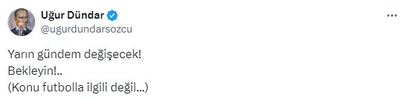 X hesabından mesaj paylaşan Dündar, "Yarın gündem değişecek! Bekleyin!.. (Konu futbolla ilgili değil...)" dedi.