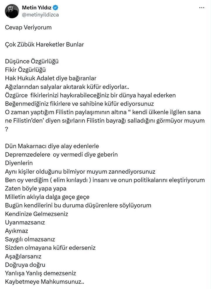 Oyuncu Metin Yıldız, Ekrem İmamoğlu’na yönelik eleştirisinin ardından bu kez de Filistin’e verdiği destekle gündeme geldi. Sosyal medya üzerinden yapılan linç girişimlerine karşı sert bir yanıt veren Yıldız, “Kaybetmeye mahkumsunuz” diyerek tepkisini dile getirdi.