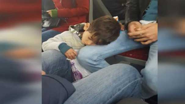 Metrobüste mendil satan bir çocuk yorgunluğa dayanamadı ve bir yolcunun dizine başını koyup uykuya daldı. O anlar başka bir yolcunun telefon kamerasına böyle yansıdı.