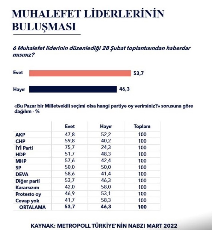 CHP, İyi Parti, Saadet Partisi, DEVA Partisi, Gelecek Partisi ve Demokrat Parti genel başkanları, Güçlendirilmiş Parlamenter Sistem metnini 28 Şubat'ta kamuoyu ile paylaşmıştı. Metropoll Araştırma, Mart ayında yaptığı ankette, seçmene söz konusu toplantıdan haberdar olup olmadığını sordu.