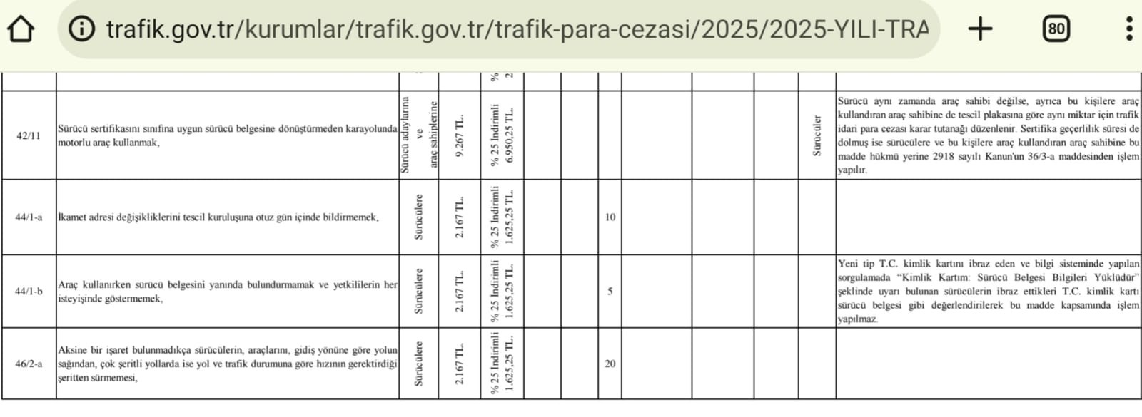 Trafik.gov.tr'de yer alan, "2025 Yılı - Trafik İdari Para Cezası Rehberi"nin 44/1-b maddesine göre, "Araç kullanırken sürücü belgesini yanında bulundurmamak ve yetkililerin her isteyişinde göstermemek" durumu 2 bin 167 TL para cezası ile cezalandırılıyor.