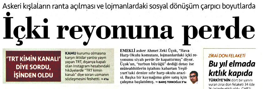 Terörle mücadele eden, Suriye ve Libya başta olmak üzere dünyanın çeşitli bölgelerinde verilen her görevi başarıyla yerine getiren TSK’yı hedef alan emekli askeri hakim Ahmet Zeki Üçok, Hava Harp Okulu lojmanlarındaki marketlerde içki reyonunun, “çocuklara kötü örnek oluyor” gerekçesiyle bir perdeyle kapatılmasından rahatsız oldu. MSB’ye bağlı orduevlerinde içki ihalesi tam gaz sürse de, Üçok, TSK’nın “dönüştürüldüğünü” savundu. 28 Şubat’ta ellerinde kadehlerle dolaşan ayyaş kafalara tepki gösteren Emekli Albay Ersan Ergür, “TSK içkiye sarılarak değil, teknolojiye sarılarak zirveye çıkabilir. TSK’nın alkol ve içkiyle anılması doğru bir yaklaşım değildir” sözleriyle tepki gösterdi.