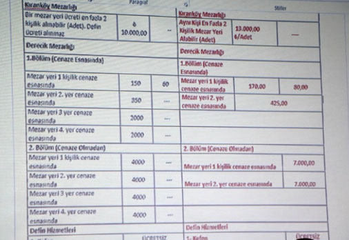 Edirnekapı Şehitlik, Feriköy, Sütlüce, Emirgan'ın aralarında bulunduğu 2. Grup mezarlıklarda yer bedeli 1.100 liradan 1.200 liraya, cenazenin yanındaki boş yer bedeli 7 bin liradan 7 bin 500 liraya, boş mezar yeri bedeli 14 bin liradan 15 bin liraya yükseldi.