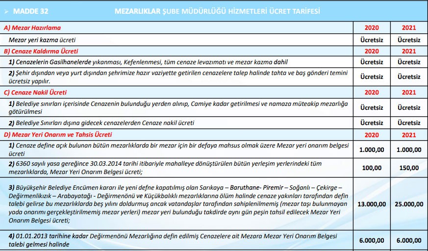 2021 mali yılı için belirlenen yeni tarifelere göre 2020 yılında gömüye açık mezarlarda 0-7 yaş grubu için lahitli mezar ücreti 150 liradan 200 liraya, 8 yaş ve üzeri mezar ücreti ise 300 liradan 400 liraya çıktı. YeniAsır’ın haberine göre, yine aynı tarifeye göre çift katlı kabir ücreti ise 1500 liradan 2 bin liraya yükselecek. 2 kişilik yapısız aile mezarı ücreti 3 bin lira iken bu rakam 1 Ocak'tan itibaren 3 bin 750 liraya yükseldi. 3 kişilik aile mezar yeri ücreti ise 18 bin liradan 22 bin liraya, 4 kişilik aile mezar ücreti ise 24 bin liradan 30 bin liraya çıktıı.