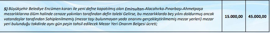 Köy statüsünde olan mezarlıkların bulunduğu 4. grupta da cenaze için yer bedeli 100 lira olarak kaldı. Cenazenin yanındaki boş yer bedeli 1.100 liradan 1.200 liraya, boş mezar yeri 2 bin 200 liradan 2 bin 400 liraya yükseldi. Azınlık mezarlarında cenaze için yer bedeli 500 lira olarak kaldı. Cenazenin yanındaki boş mezar yeri 4 bin 400 liradan 4 bin 800 liraya, boş mezar yeri 7 bin 150 liradan 7 bin 800 liraya çıkarıldı.