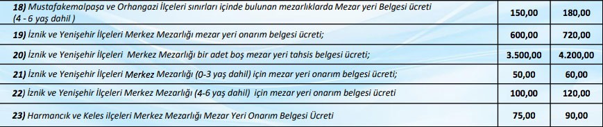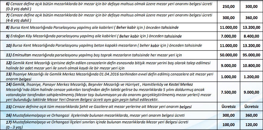 Bursa mezarlık fiyatları tarife ücretleri şu şekilde: