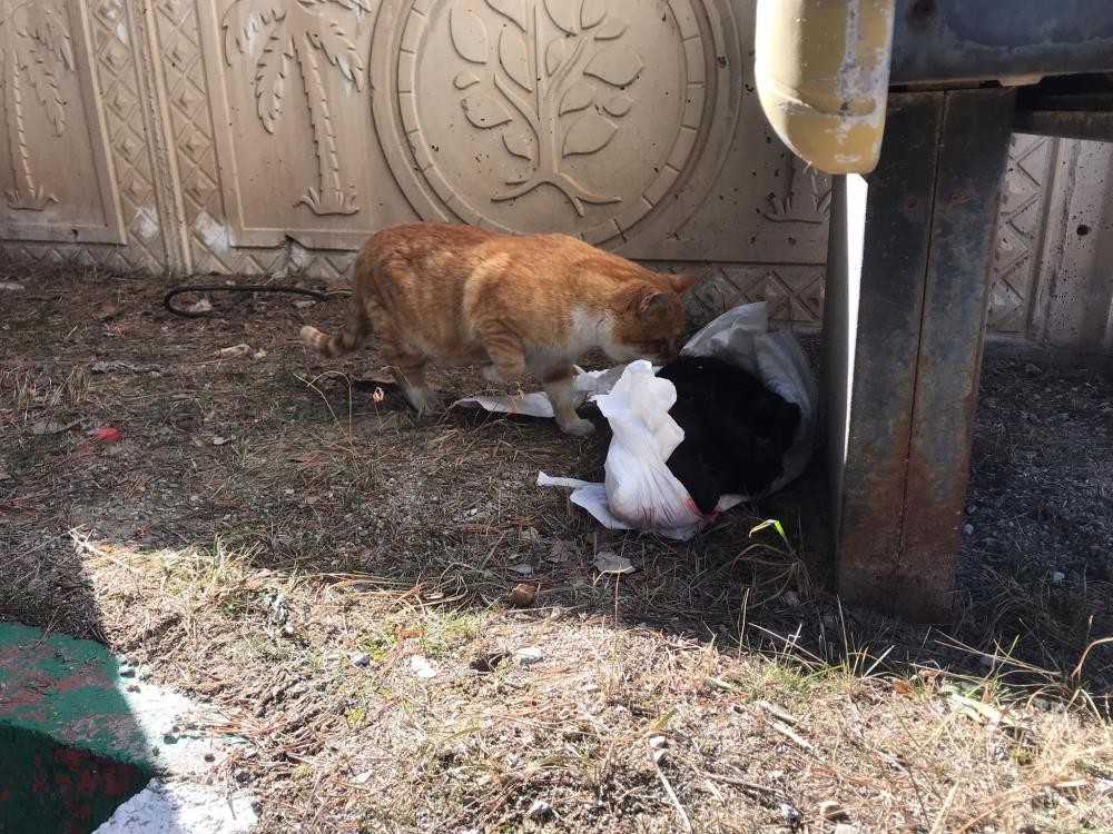 Öte yandan, torba içerisinde cansız bedeni bulunan kedinin yanına gelen başka bir kedinin ise bir süre başında beklediği gözlendi.