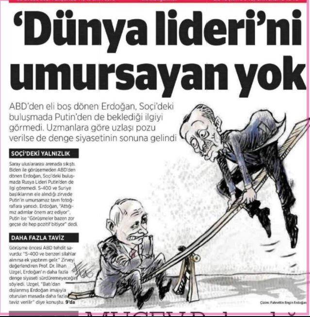 Bugüne kadar Rusya, İran ve Türkiye üçlüsünün bölgesel konularda büyük önem arz eden görüşmelerini unutan Birgün, Erdoğan-Putin görüşmesini 'Dünya liderini umursayan yok' başlığıyla okuyucularına sundu. Birçok konuda görüş alışverişi yapılan zirveyi çirkin bir üslupla kaleme alan solak gazete, habere bir de karikatür ekledi. Erdoğan'ın Putin'den beklediği ilgiyi göremediğini iddia eden Birgün, denge siyasetinin sona erdiğini öne sürerek yakışıksız bir karikatürle bu haberinde yaptığı çirkinliği tescilledi. Birgün'ün bu haberi ve karikatürü vatandaşların büyük tepkisini toplarken, vatan hainlerini ise bir hayli sevindirdi.