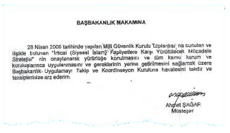 Ecevit hükümetinin Başbakanlık müsteşarı Ahmet Şağar'ın imzası, dönemin Başbakanı Bülent Ecevit'in 'olur'u ile yürürlüğe giren ve tüm devlet birimlerine gönderilen 18.05.2000 tarihli 'İrticai Faaliyetlere Karşı Yürütülecek Mücadele Stratejisi' belgesinde, '28 Nisan 2000 tarihinde yapılan Milli Güvenlik Kurulu Toplantısı'na sunulan ve ilişikte bulunan, 'İrtica (siyasal İslam) Faaliyetlere Karşı Yürütülecek Mücadele Stratejisi'nin onaylanarak yürürlüğe konulmasını ve tüm kamu kurum ve kuruluşlarınca uygulanmasını ve gereklerinin yerine getirilmesini sağlamak üzere Başbakanlık Uygulamayı Takip ve Koordinasyon Kurulu'na (BUTKK) havalesini takdir ve tensiplerinize arz ederim' deniliyor.