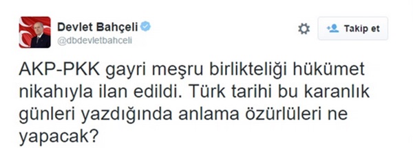 140 karakterlik anlamsız bir Tweet mesajı yazabilmek adına, sırtımızı teröristlere dayadık diyen, PKK Türkiyeyi tükürüğüyle boğar diyen adamlara bakanlık veren bir parti milli değildir. Ne hesabı yapmıştır, okyanus ötesinden emir mi almıştır, şantaj mağduru mudur yoksa strateji gibi görünen sığ bir kurnazlığın peşinde mi heba oldular bilmiyorum, neticeyle ilgileniyorum ve Devlet Bahçeli’nin PKK’ya verdiği bakanlıkları görüyorum.